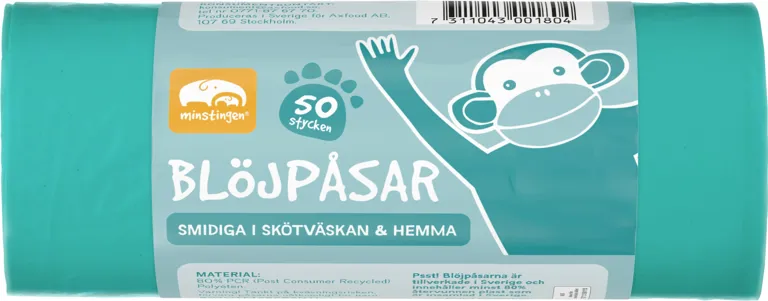 Blöjpåsar med knythandtag. Smidiga att ha i skötväskan och i hemmet. Blöjpåsarna är tillverkade i Sverige och innehåller minst 80% återvunnen plast som är insamlad i Sverige.
