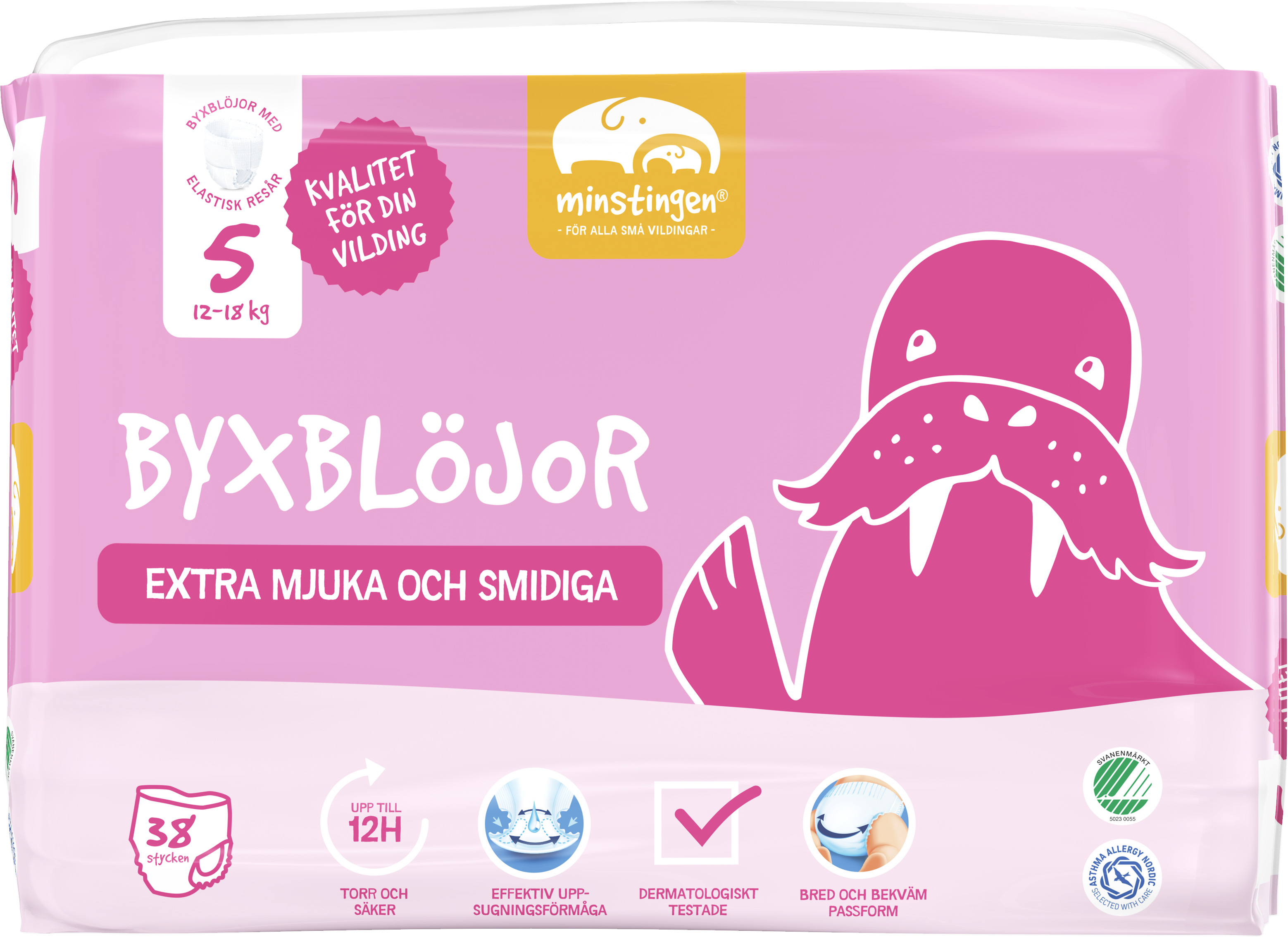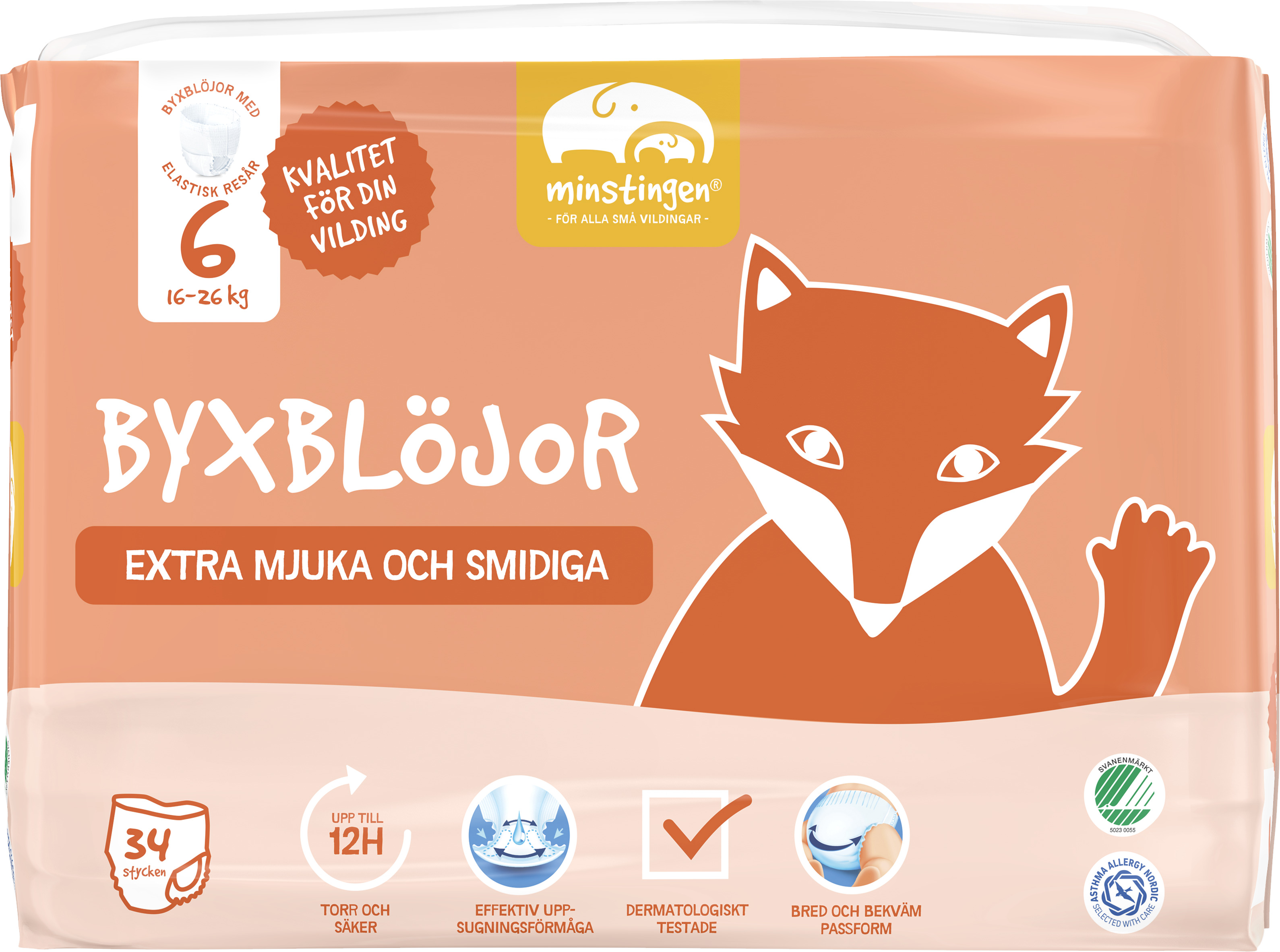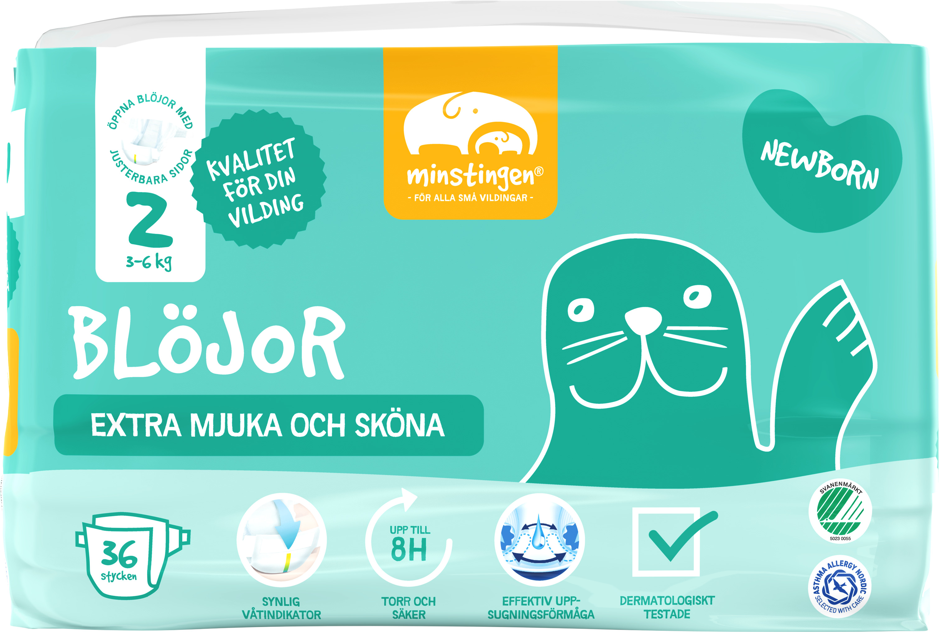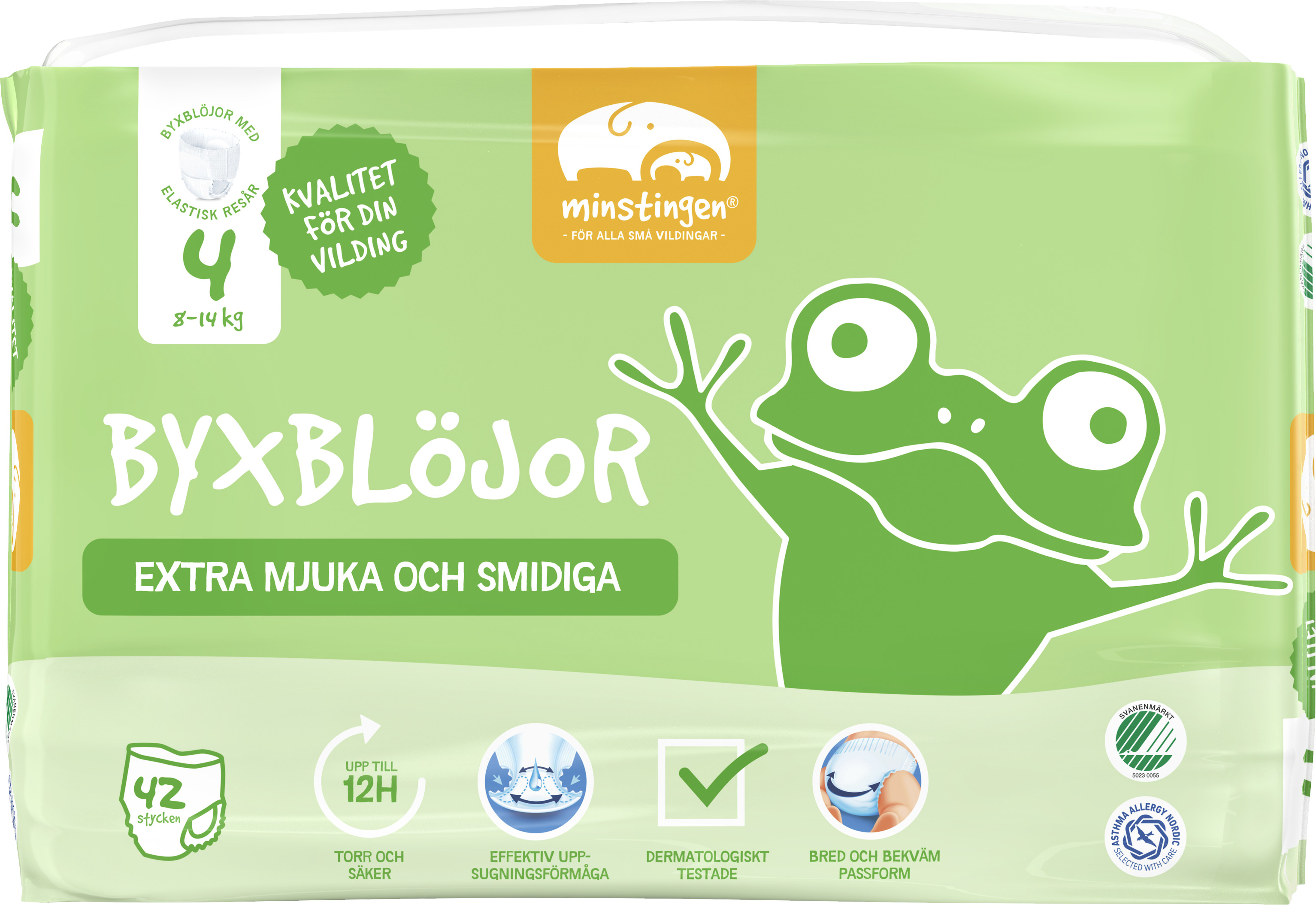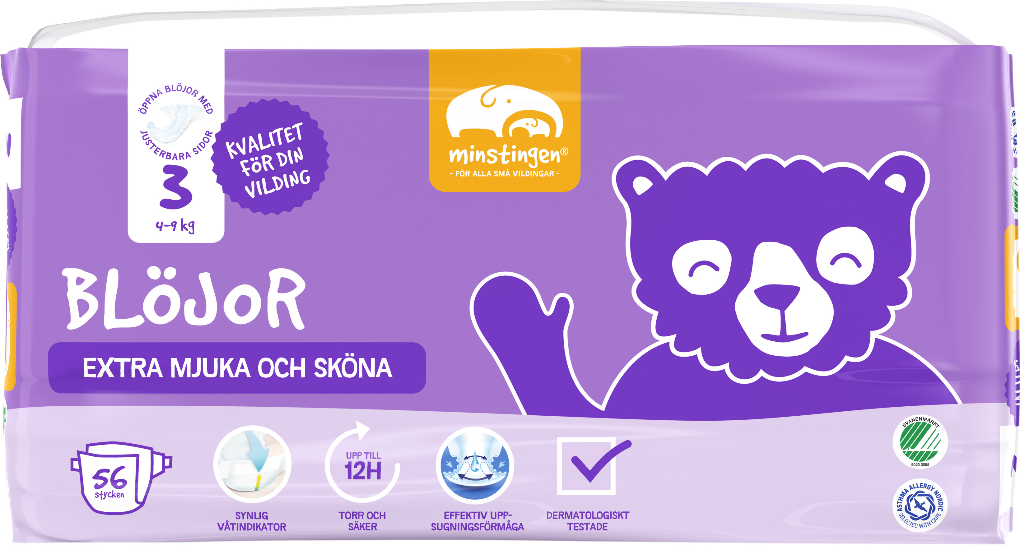 Våra blöjor har ett innovativt ytskikt, där ytskiktets kärna har en aktiv flödeskanal som ger bättre vätskefördelning i blöjan och långvarigt kapslar in vätska. På utvalda storlekar finns även en våtindikator för att du enkelt ska se när det är dags att byta blöja. Allt för att din vilding ska hålla sig skönt torr upp till 8-12 timmar. Alla blöjor är dermatologiskt testade, parfym- och lotionfria, svanenmärkta och godkända av Asthma Allergy Nordic.