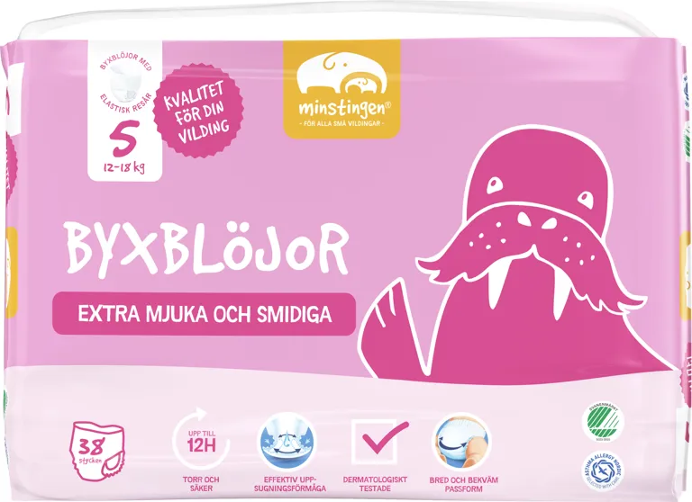 Våra byxblöjor i storlek 5 har en bred och bekväm passform som passar barn från 12-18 kg. Blöjan är uppbyggd med en elastisk resår i midja och ben för en töjbar och trygg känsla när ditt barn rör sig. I blöjans kärna finns en aktiv flödeskanal som ger bättre vätskefördelning och långvarigt kapslar in vätska. Allt för att din vilding ska hålla sig skönt torr upp till 12 timmar. Blöjan är dermatologiskt testad, parfym- och lotionfri, Svanenmärkt och godkänd av Asthma Allergy Nordic. Förpackningen innehåller 38 blöjor och består dessutom av 51% återvunnen plast.