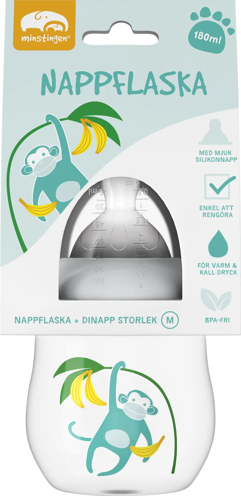 Nappflaska 180ml med tillhörande dinapp av mjuk silikon. Flaskan håller för både varm och kall dryck och är enkel att rengöra. När vätskan ska värmas i flaskan måste det ske utan förskruvning och dinapp. Flaskan kan användas i mikrovågsugn. Material: BPA-fri nappflaska och dinapp. Nappflaska av polypropen (PP) och dinapp i mjuk silikon.
